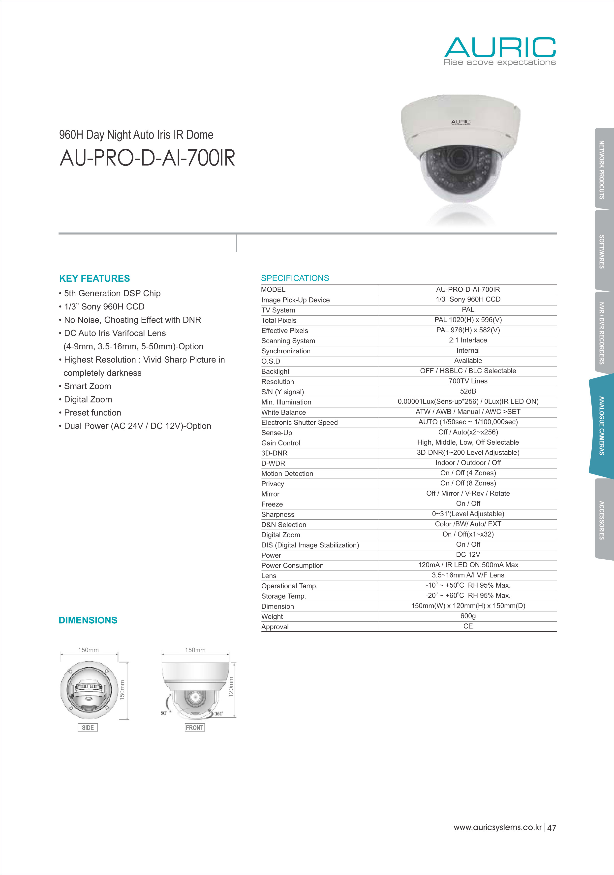 AU-PRO-D-AI-700IR : 20M A/I V/F IR DAY NIGHT DOME 700TVL